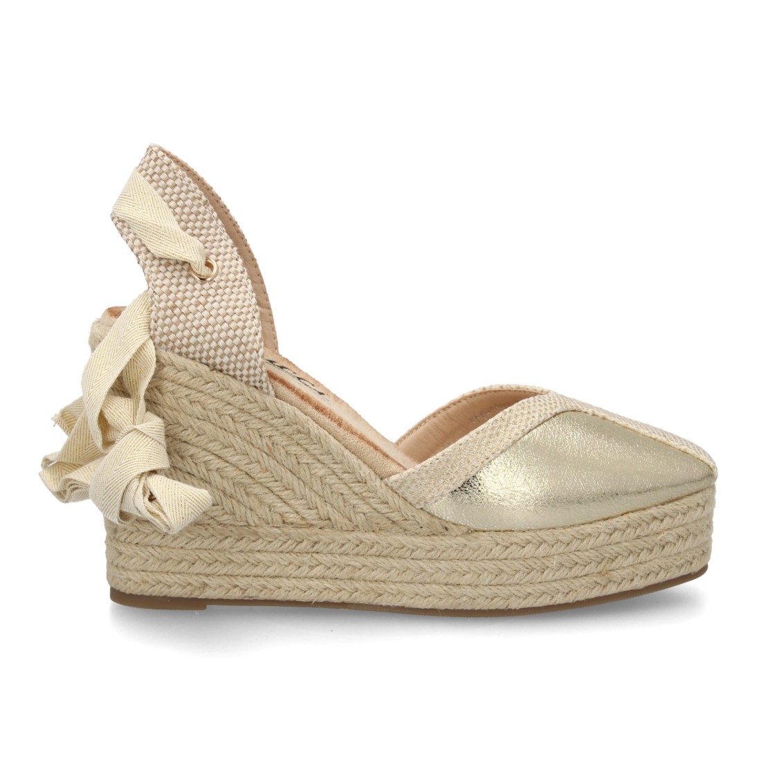 Las Alpargatas Cuña Lazo Oro son una apuesta perfecta para quienes buscan un calzado femenino, elegante y cómodo para los meses de primavera y verano. Su diseño combina una base textil en tono beige suave con puntera metalizada en color oro, creando un contraste luminoso, sofisticado y muy favorecedor. El gran lazo trasero aporta personalidad y convierte este modelo en una opción especial para elevar cualquier look sin renunciar a la frescura y ligereza que tanto apetece en la temporada cálida.