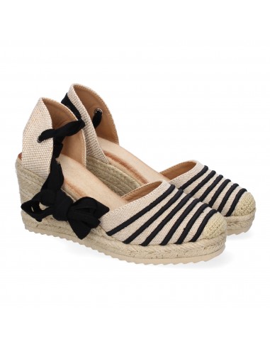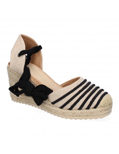 Un clásico renovado. Estas alpargatas de cuña en color beige con detalles en negro son perfectas para un look sofisticado y versátil. Su diseño con lazos ajustables y su suela de esparto brindan comodidad y estilo en cada paso.