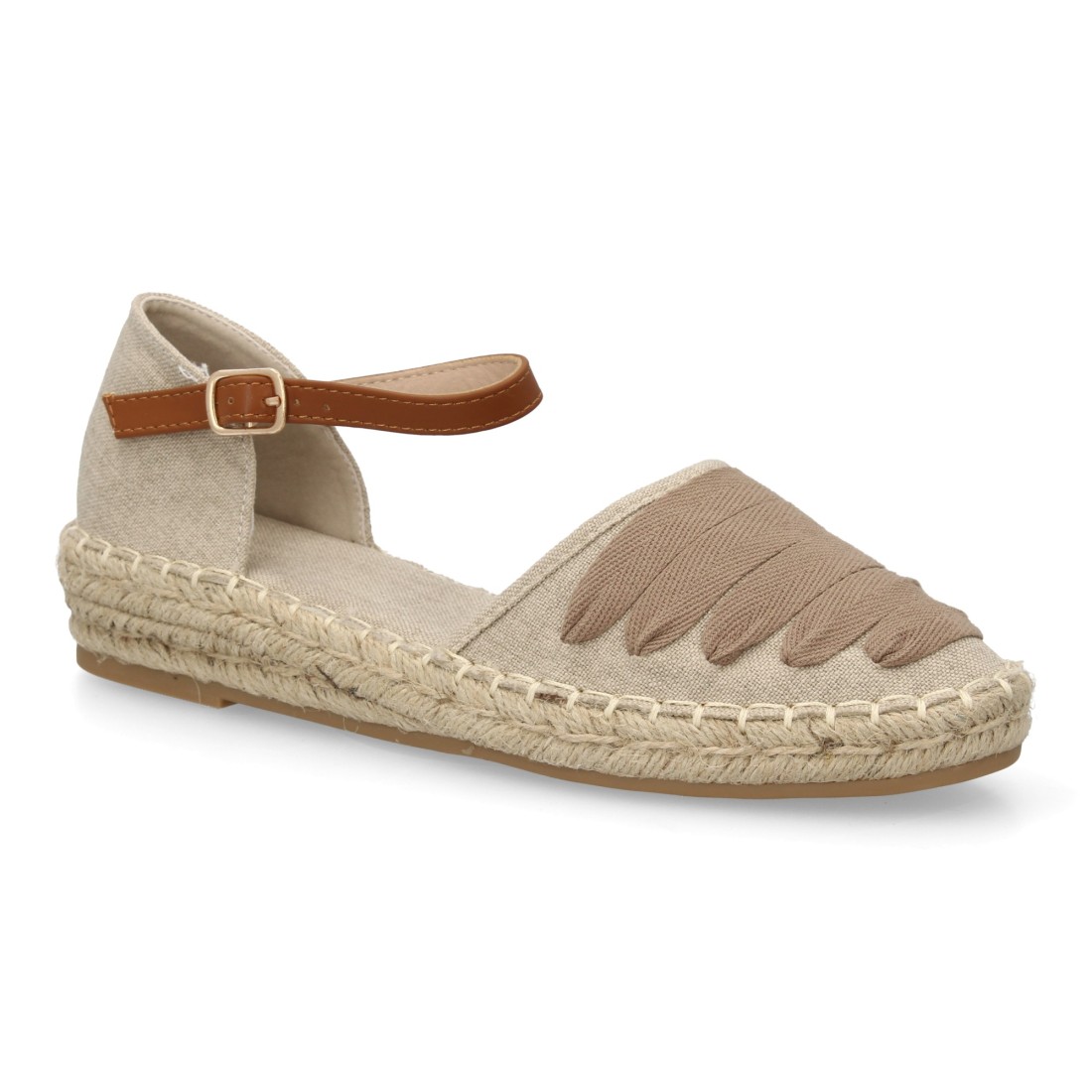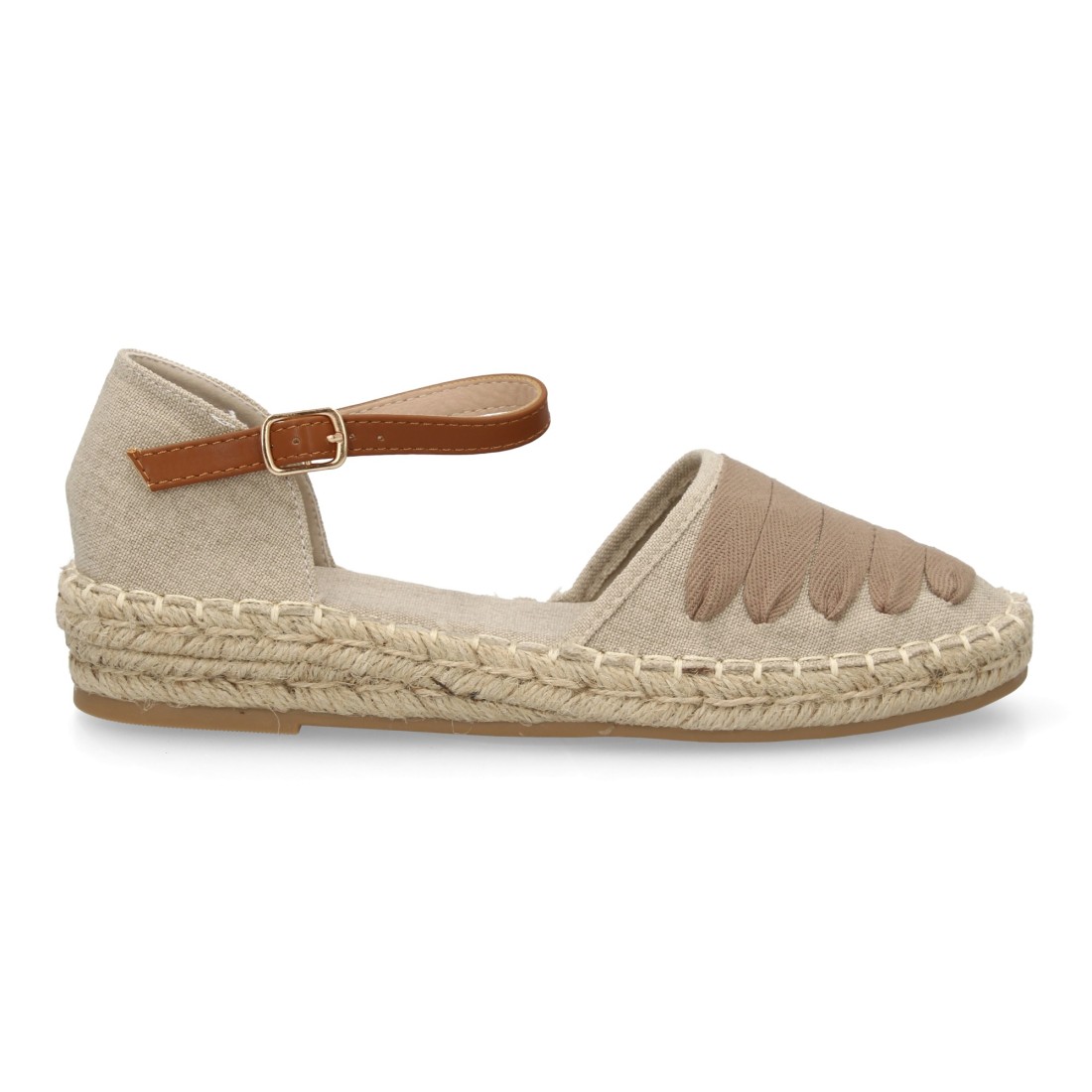 - Diseño tipo alpargata con tiras de lazo de algodón en color kaki