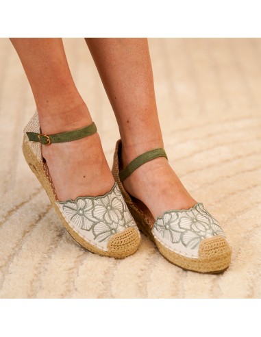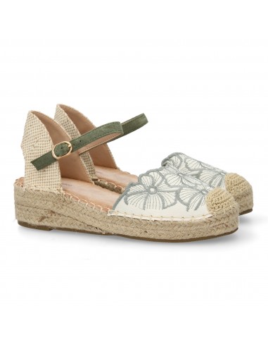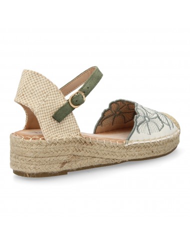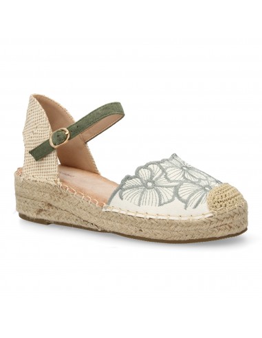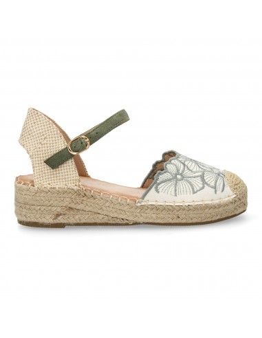 Sandalia de Cuña con Yute y Bordado Floral Verde Oliva