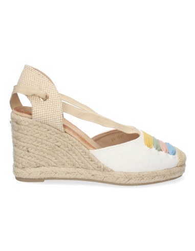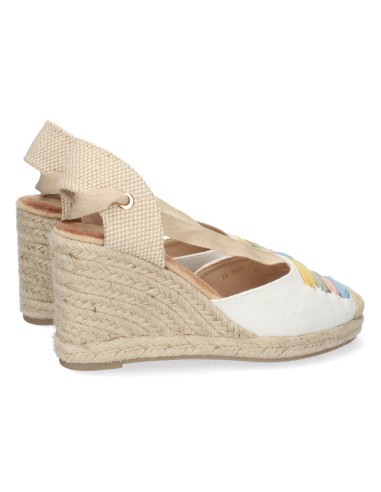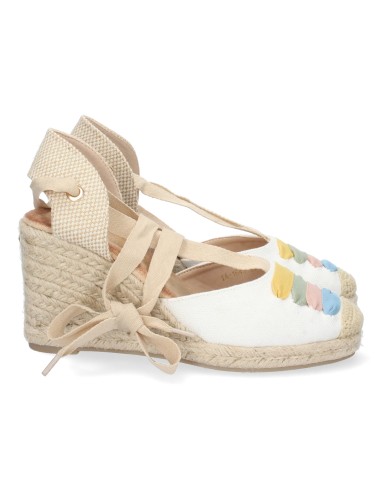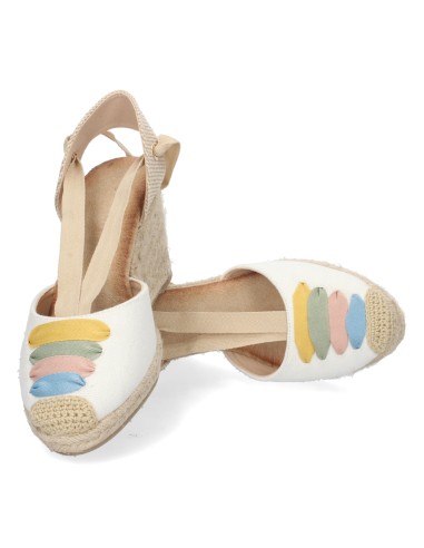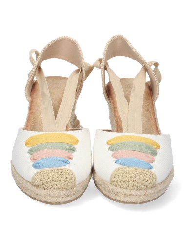 La alegría del color y el encanto artesanal se unen en estas sandalias de cuña con pala cerrada y detalle multicolor en tonos pastel. Su diseño combina la frescura del blanco con un toque divertido y femenino gracias a los bordados de colores. El cierre de cordones al tobillo y la cuña forrada de yute le dan un aire romántico y tradicional, ideal para tus looks más veraniegos.