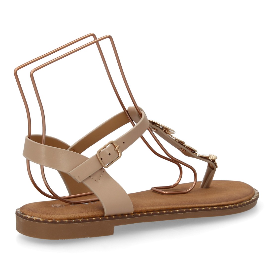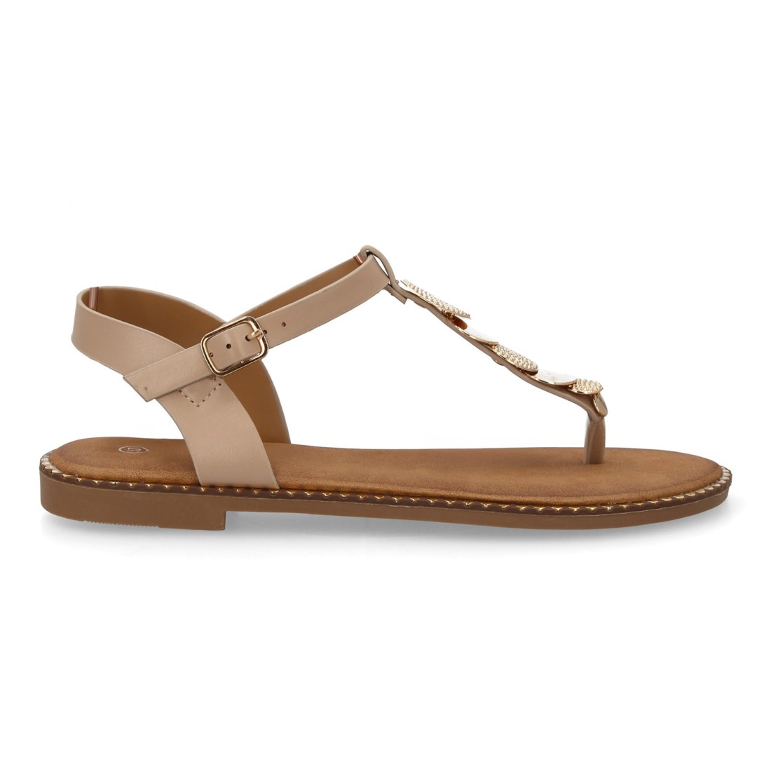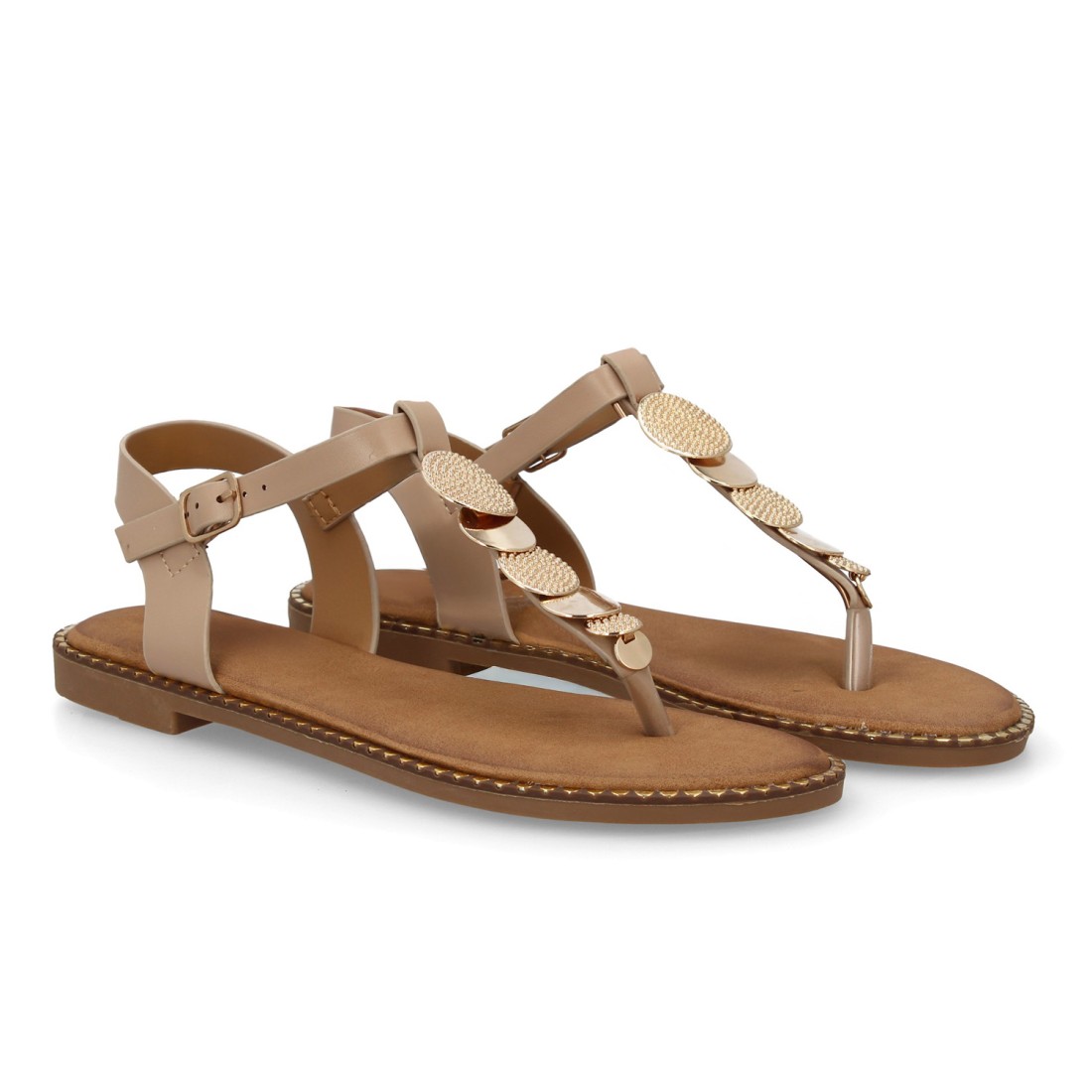Este modelo para mujer destaca por su estructura plana, perfecta para caminar con naturalidad y comodidad durante horas. El tacón bajo favorece una pisada estable, mientras que la ausencia de plataforma mantiene una silueta ligera y estilizada. La tira que separa el dedo aporta una sujeción práctica y un aire veraniego, mientras que la pieza central decorada con discos dorados estiliza visualmente el empeine. Además, el cierre lateral con hebilla permite ajustar mejor la sandalia al tobillo, mejorando la sujeción y haciendo que resulte cómoda para paseos, escapadas, vacaciones, jornadas largas o días en los que buscas frescura sin renunciar al estilo.
