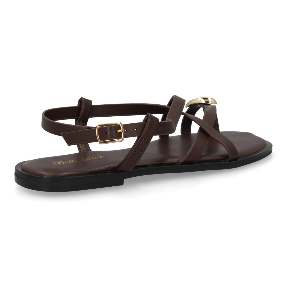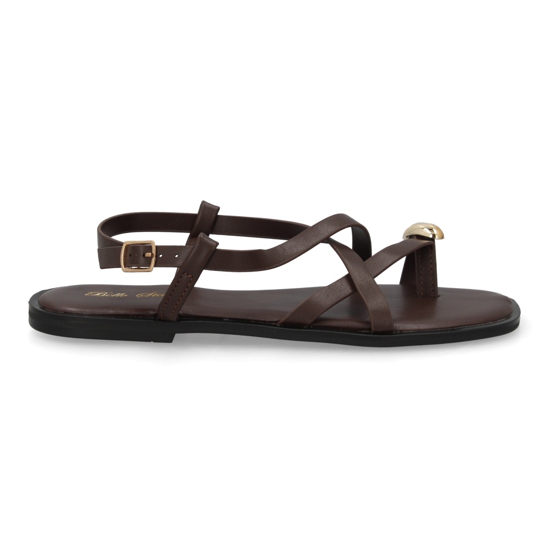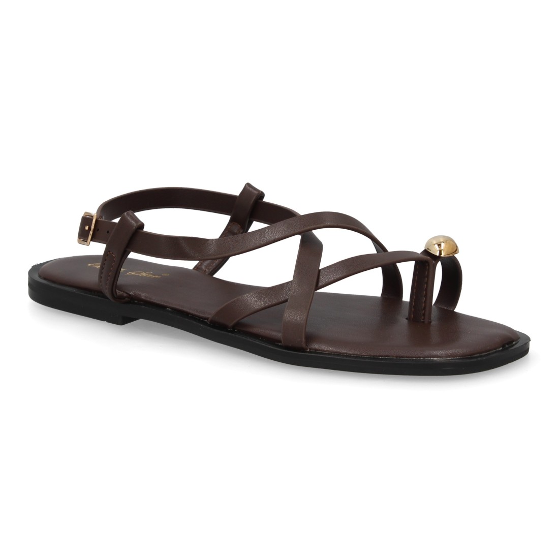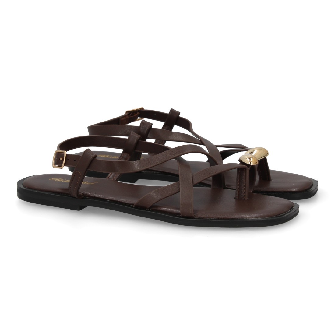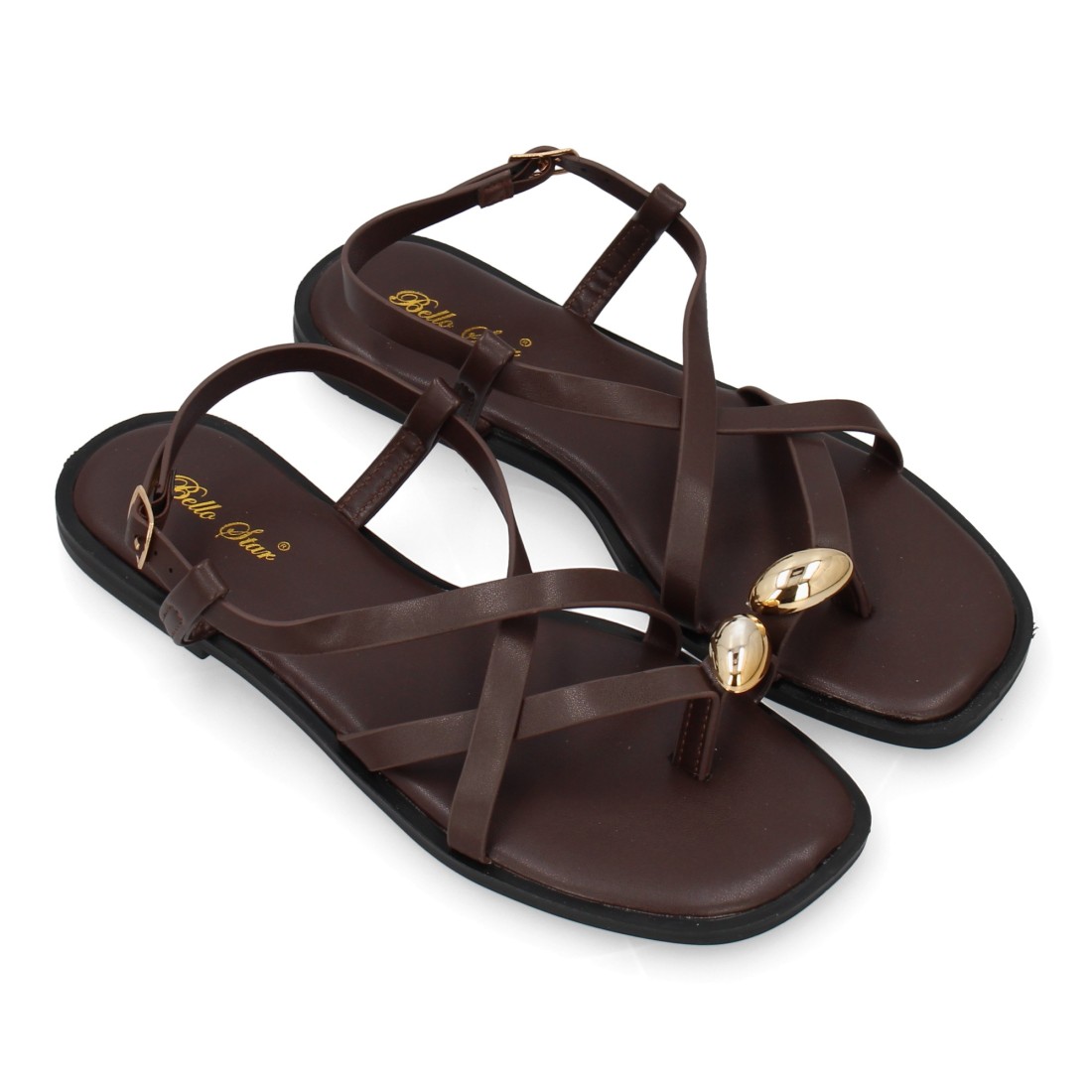 Uno de los elementos más especiales de estas sandalias es su detalle decorativo dorado situado en la parte delantera. Este acabado metálico aporta luz y un efecto joya sutil que transforma una sandalia plana en una pieza más llamativa y especial. El contraste entre el marrón y el dorado crea un equilibrio muy elegante, por lo que este modelo combina especialmente bien con prendas lisas, tejidos naturales y accesorios en tonos cálidos. Es una sandalia perfecta para quienes valoran los pequeños detalles y buscan un calzado sencillo, pero con personalidad y con un acabado visualmente más refinado.