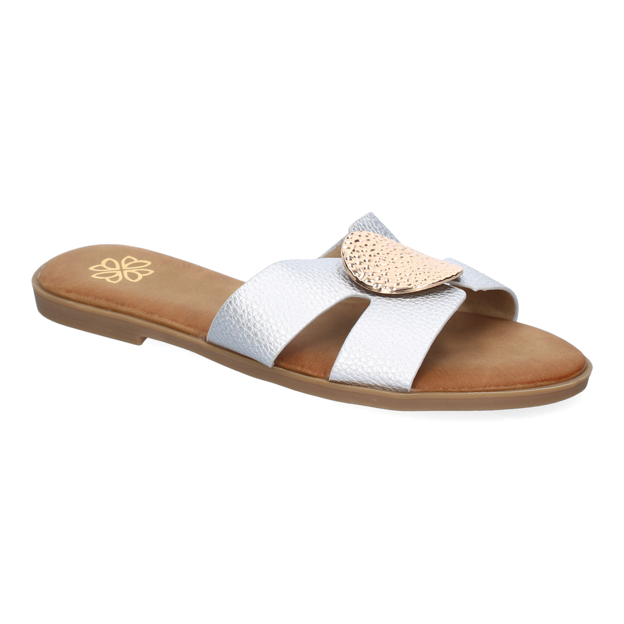 Luce un estilo moderno y refinado con estas sandalias planas en color plata, diseñadas para aportar un toque de brillo y sofisticación a tus looks de verano. El adorno metálico sobre la pala potencia su estilo chic, mientras que su diseño cómodo las convierte en un imprescindible para cualquier ocasión.