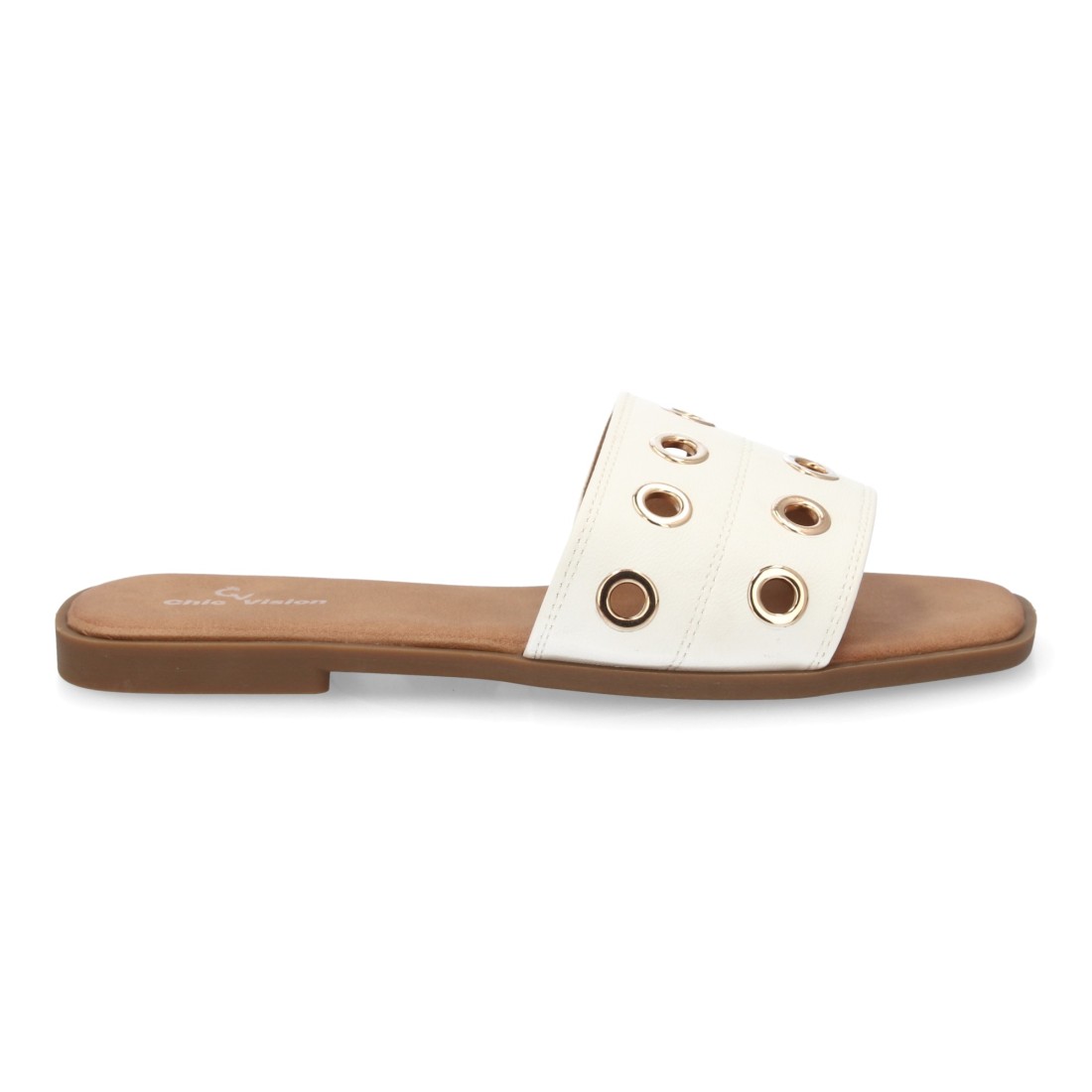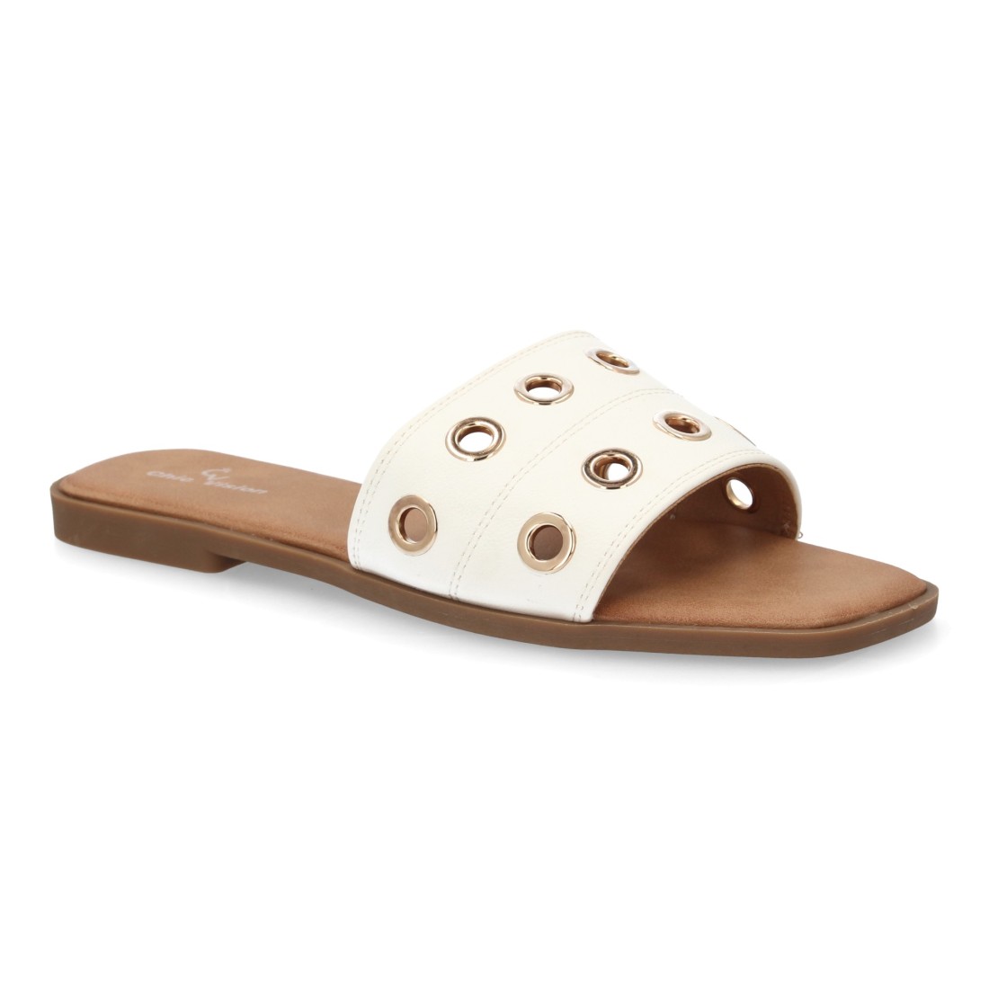 El material principal presenta un acabado suave y flexible que se adapta al pie sin generar rozaduras. La tira ancha en el empeine, decorada con aros metálicos, sujeta el pie de forma estable, proporcionando seguridad al caminar sin necesidad de correas adicionales. Esta característica las hace ideales tanto para paseos urbanos como para escapadas de verano, donde la comodidad es clave.