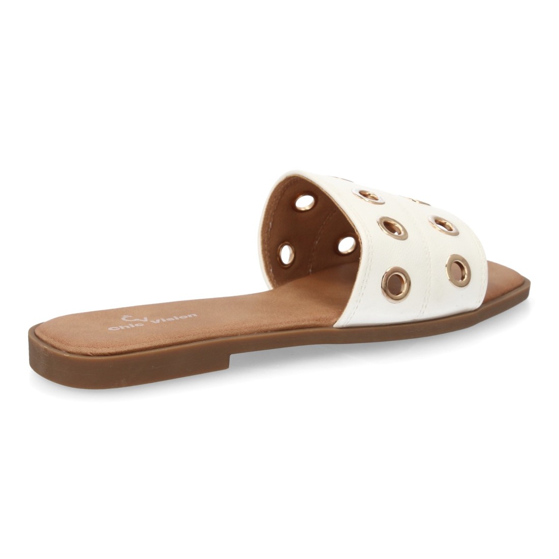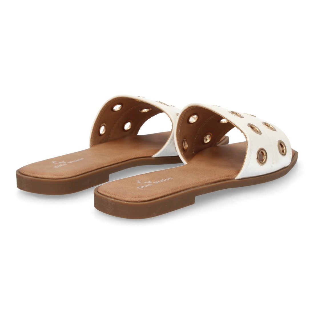 Sandalias Planas Blancas con Detalle de Aros Dorados, perfectas para el día a día gracias a su comodidad y estilo versátil. Un básico imprescindible para looks frescos y elegantes en primavera y verano.