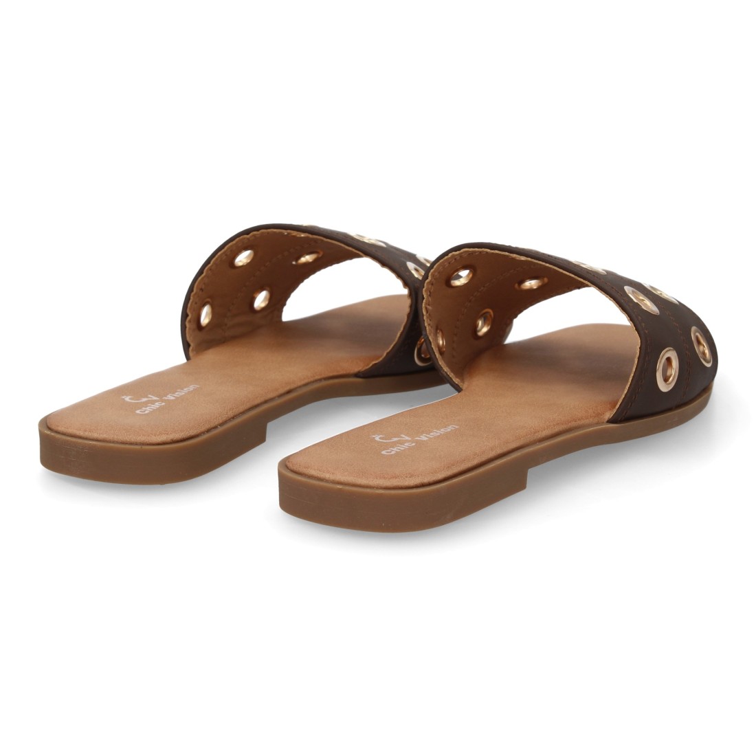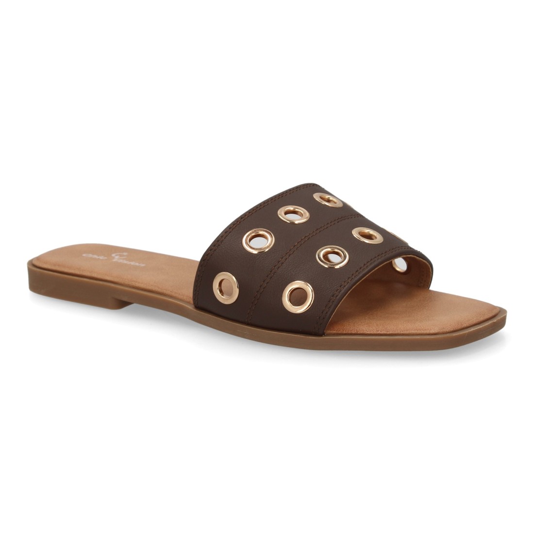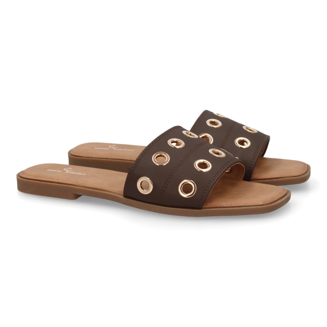 Las Sandalias Planas en Color Marrón con Detalle de Arandelas metálicas doradas son el equilibrio perfecto entre comodidad, estilo y versatilidad para la temporada primavera-verano. Diseñadas para acompañarte en tu día a día, este modelo destaca por su estética minimalista con un toque sofisticado, convirtiéndose en una opción imprescindible para quienes buscan un calzado práctico sin renunciar a una imagen cuidada. El tono marrón aporta calidez y naturalidad, lo que facilita su combinación con una amplia variedad de prendas y estilos.