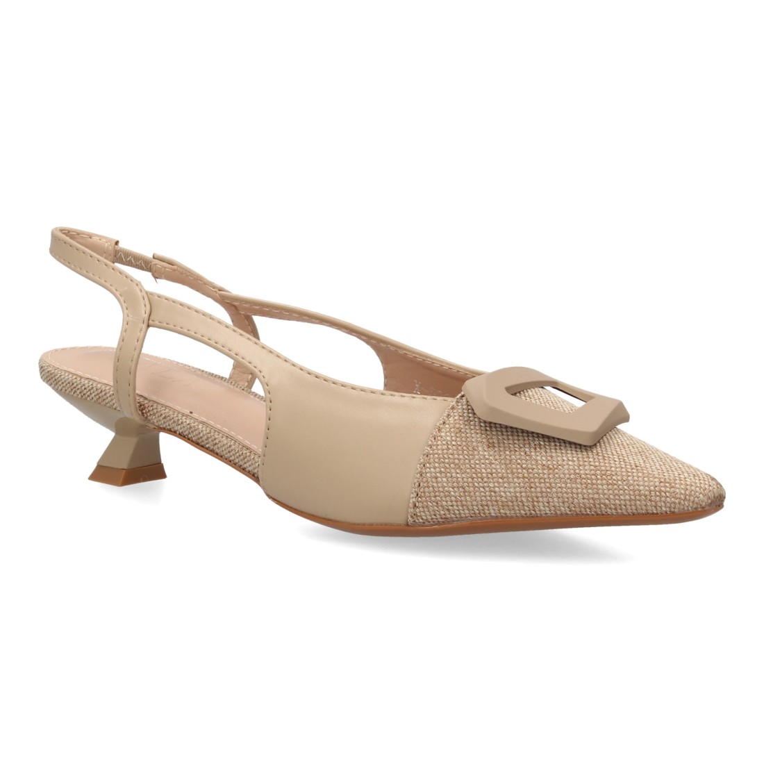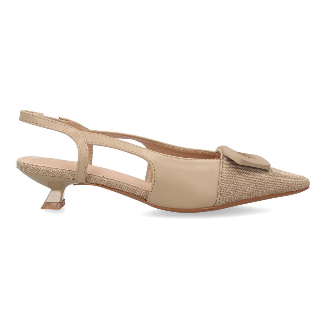 Zapatos Destalonados Beige con Tacón Bajo y Hebilla Elegante detalle de hebilla decorativa. Un diseño sofisticado y cómodo perfecto para el día a día o para looks más formales.